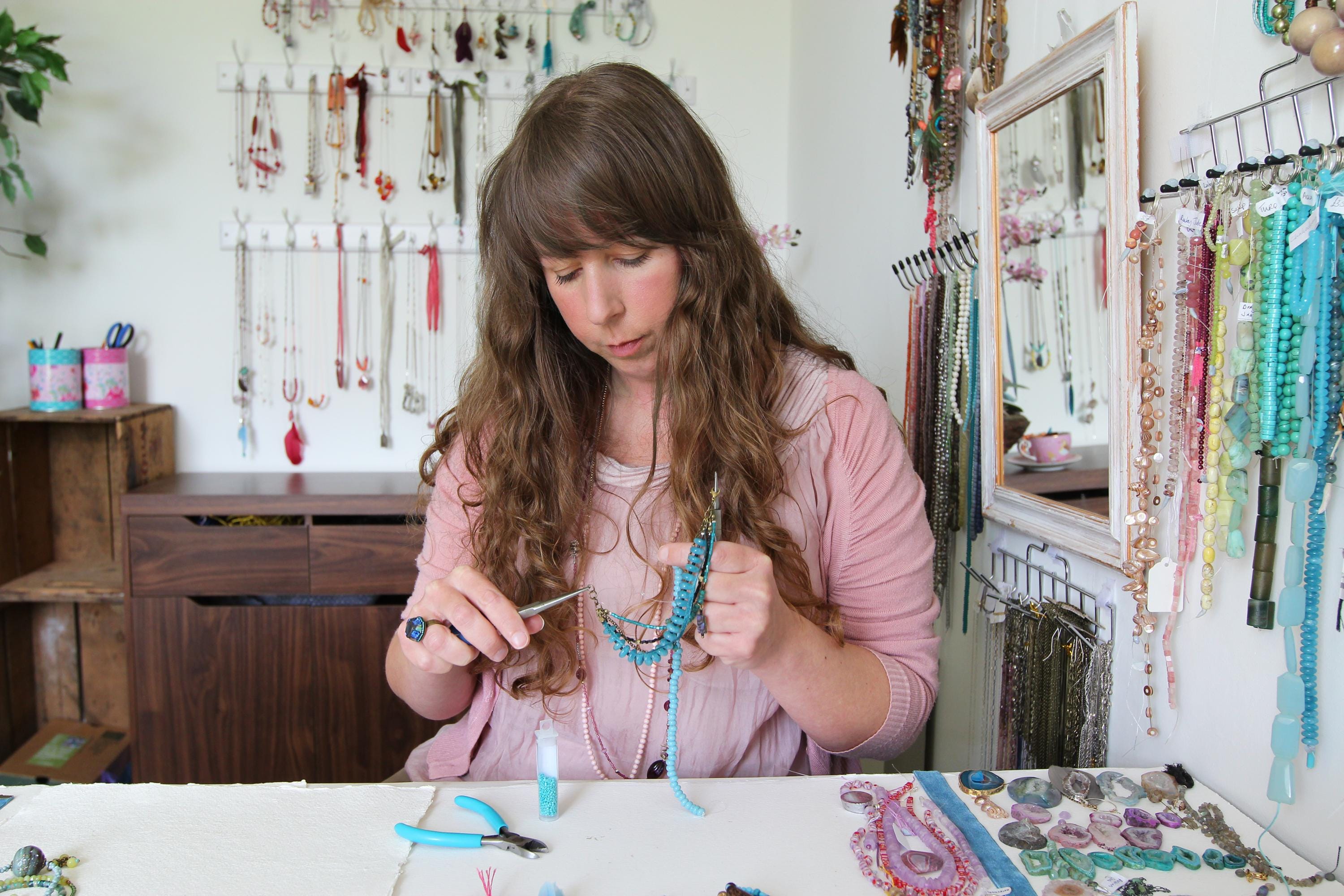 I am totally inspired by the jewellery materials themselves - gemstones, pebbles, metals, feathers, and threads. Everyday I delight in the raw materials that sit in my studio. I'll start creating something by surveying these little collections and seeing which one I'm drawn to working with on the day, which one speaks to me, which story wants to be told. I love to let my imagination wander and pick out little colour stories that weave from one item to another. Colours that speak of the forest, in deep and verdant tones, or perhaps exotic tales of birds and their fanciful feathers - iridescent and exquisite. Every piece has a story to tell, which in turn becomes a part of it’s wearer’s story and journey.