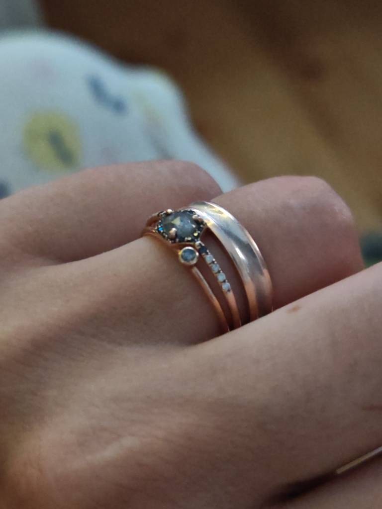 Featuring a single solitaire diamond in a teeny-tiny 2mm brilliant round cut, bezel set into a smooth band. The black and white inclusions make these diamonds very distinctive and give them their unique, contemporary look. They change beautifully with the light - sometimes appearing a bit dark and moody, other times bright and sparkly. I love this combination of the grey sparkle of the diamond with the feminine, lustrous, rose gold metal - a stylish combination, and a personal favourite. A great way to add a unique and stylish touch to your ring stack or collection.