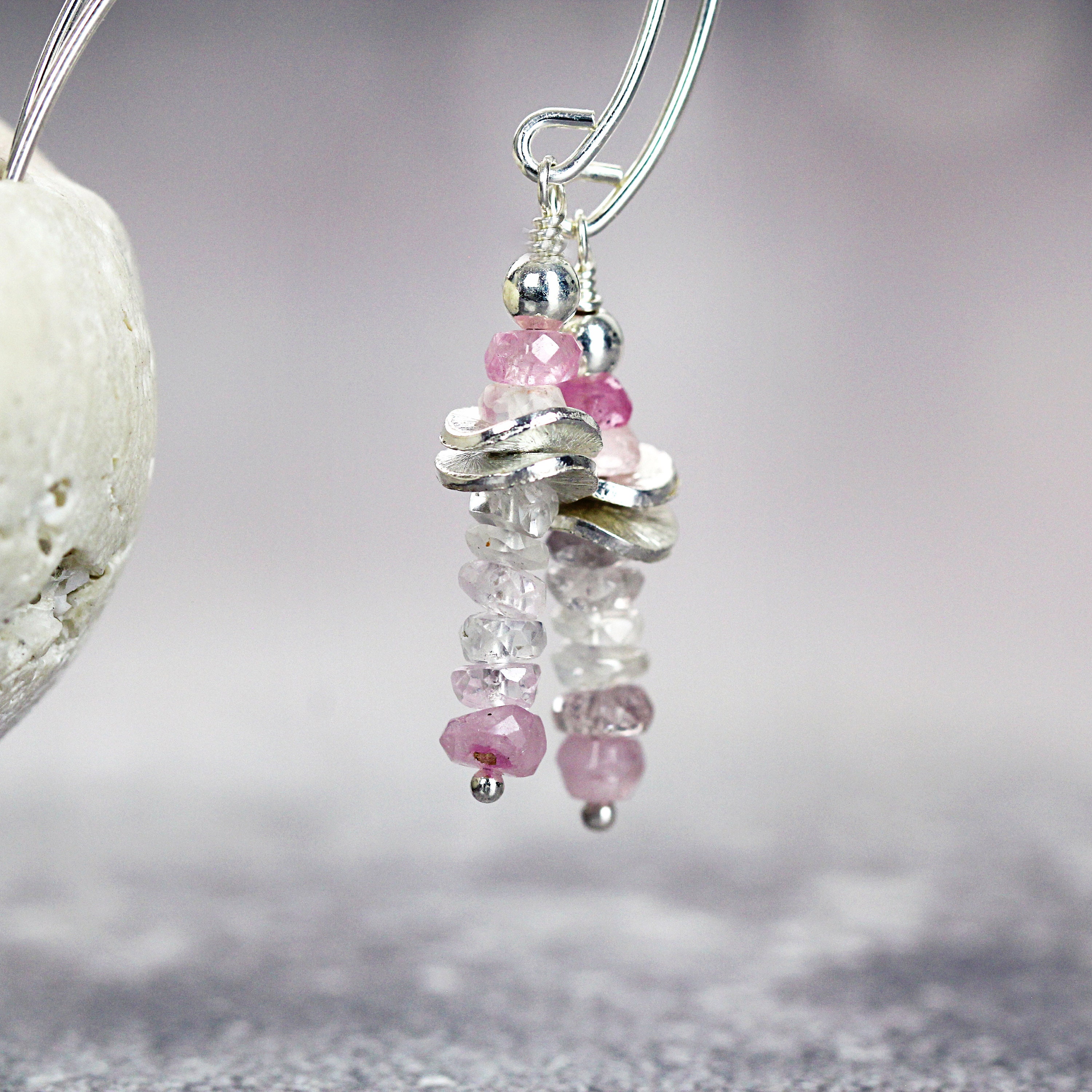 Featuring genuine, quality, hand cut, pink and white sapphires on elegant sterling silver ear hooks. Stacked in an ombre pattern that travels from pink to white back to pink again. Punctuated with sterling silver discs for a more contemporary look, which balances the dainty, ethereal vibe of these lovely earrings.